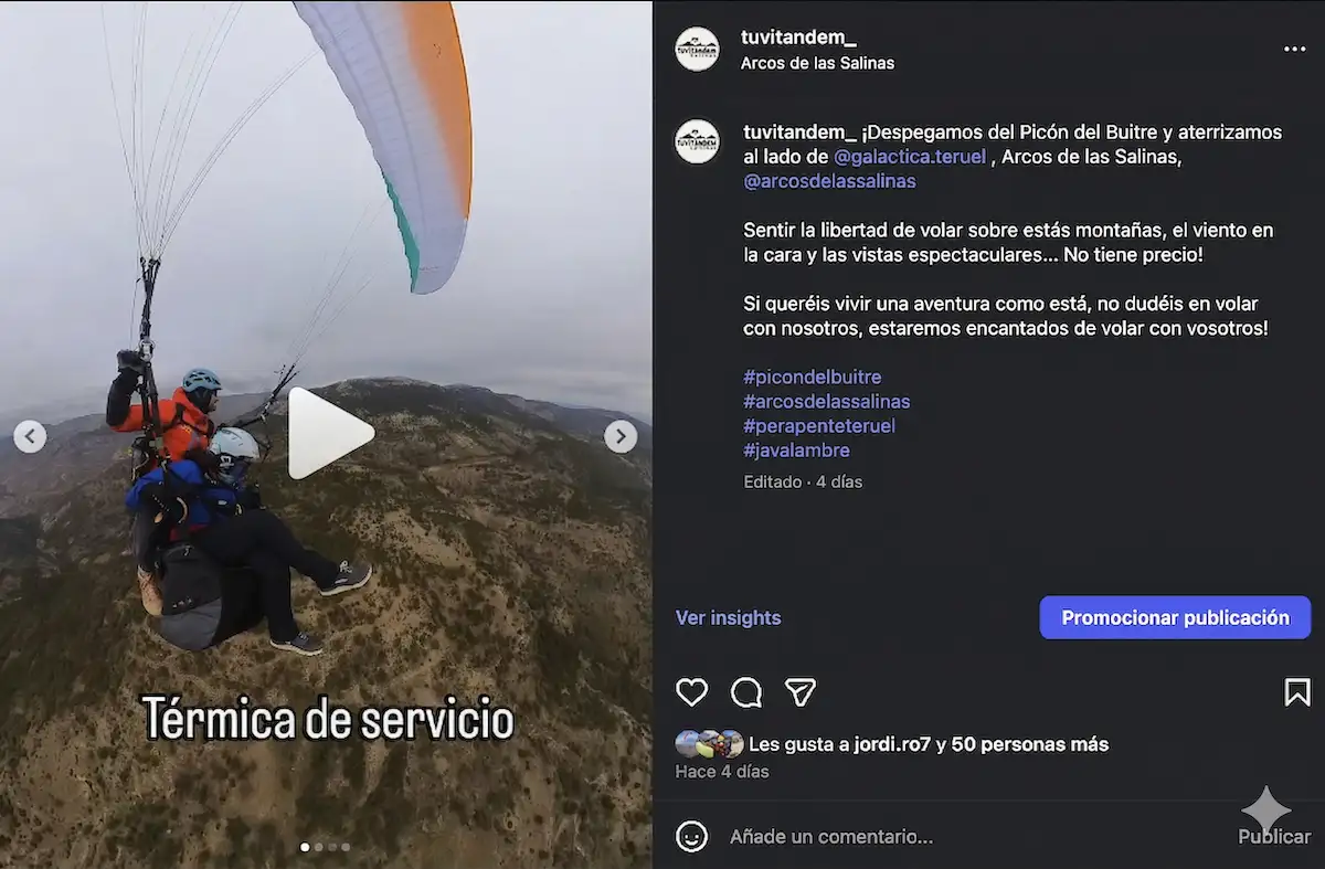 Es un vuelo silencioso, imponente y lleno de una belleza especial. Finalmente, tras un largo planeo, aterrizaremos suavemente en la localidad de Arcos de las Salinas, completando un desnivel importante.